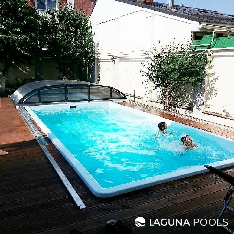Композитный бассейн с двумя купающимися и арочным прозрачным укрытием во внутреннем дворе.